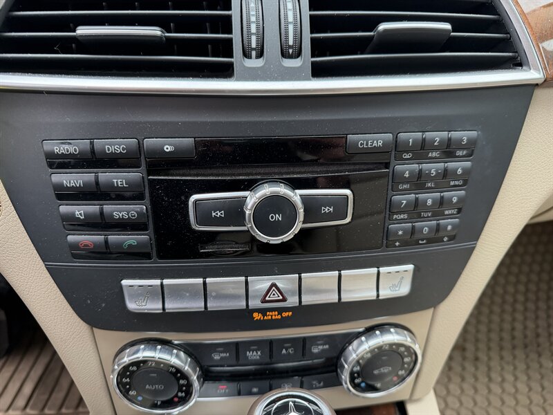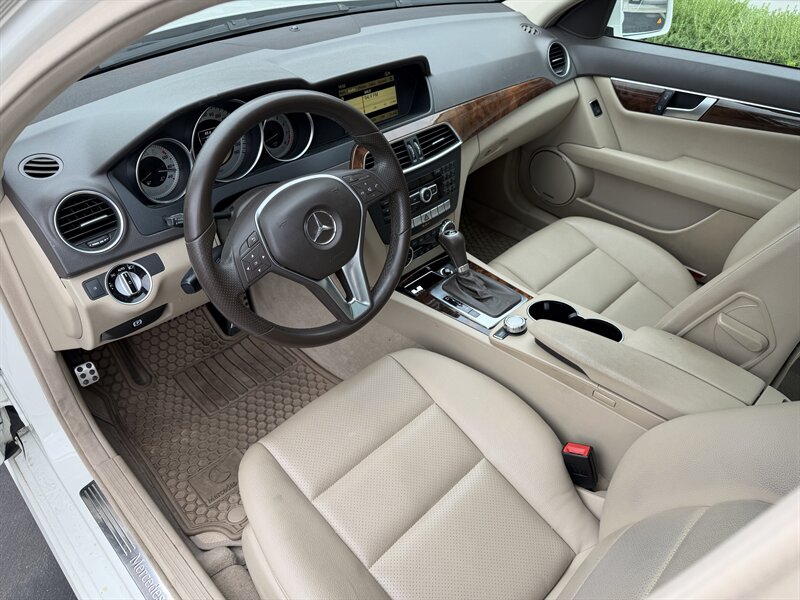 2012 Mercedes-Benz C250 Sport in Arctic White with Almond interior. Powered by a 1.8L turbocharged inline-4 producing 201 hp and 229 lb-ft of torque, paired with a 7-speed automatic transmission and rear-wheel drive; Sport tuning provides firmer suspension and sport styling. Factory equipment includes power windows, locks and mirrors; dual-zone automatic climate control; power-adjustable front seats trimmed in Almond leather; leather-wrapped multifunction steering wheel with Bluetooth phone and audio controls; AM/FM/CD audio with auxiliary/USB/iPod input and Bluetooth streaming; alloy wheels, fog lamps and projector headlights. Standard safety features include anti-lock brakes (ABS), electronic stability control, traction control, Brake Assist, and front/side/curtain airbags with tire pressure monitoring. Below 125,000 miles (averaging under 9,000 miles/year), EPA-rated 21 MPG city / 31 MPG highway, and in excellent overall condition.